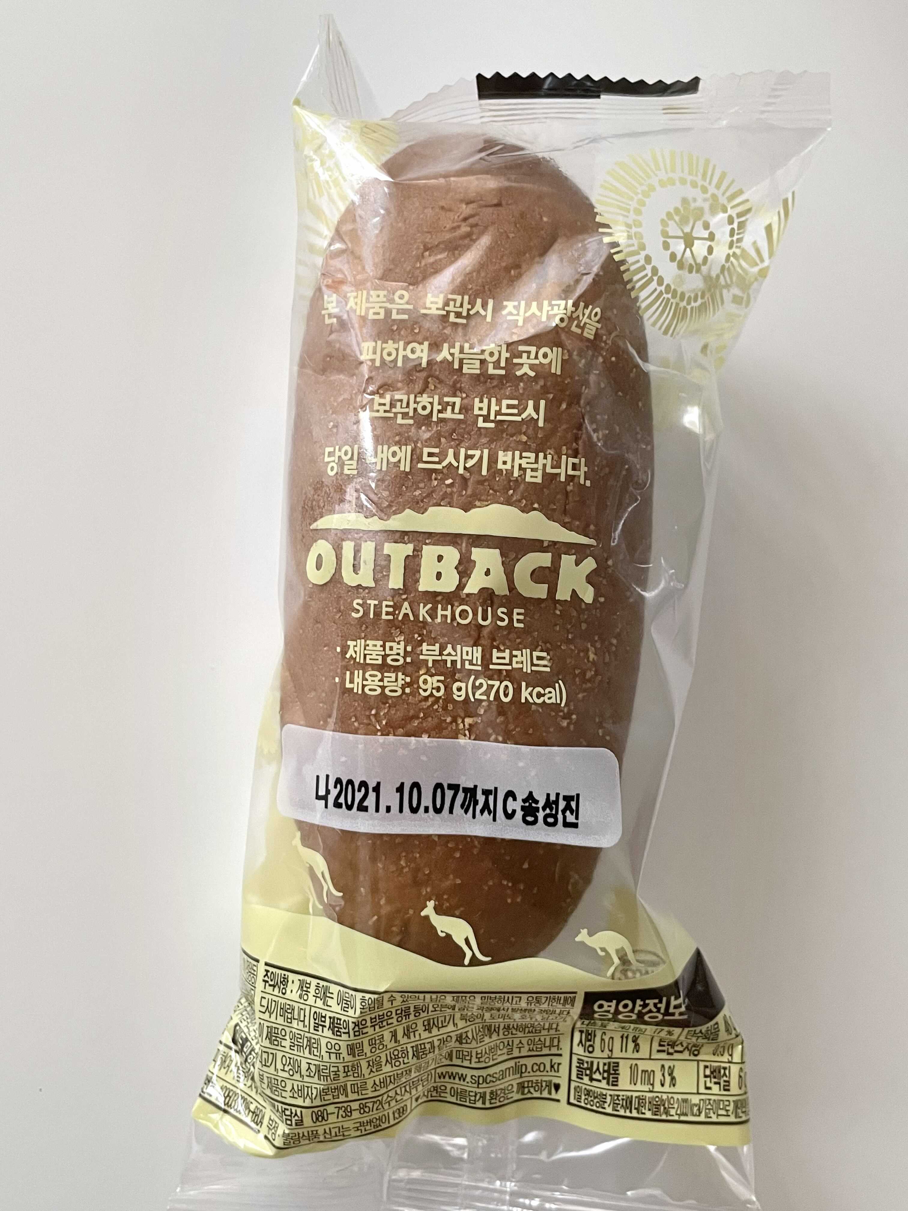 아웃백 부쉬맨 브레드 아웃백 포장하면서 아웃백 빵 부쉬맨 브레드도 같이 포장해왔어요. 아웃백의 상징이라고도 할 수 있는 부쉬맨 브레드는 따로 구매해 먹는 사람들도 있을 정도로 마니아층이 엄청 많더라고요. 부쉬맨 브레드 판매 가격은 1,100원입니다.
