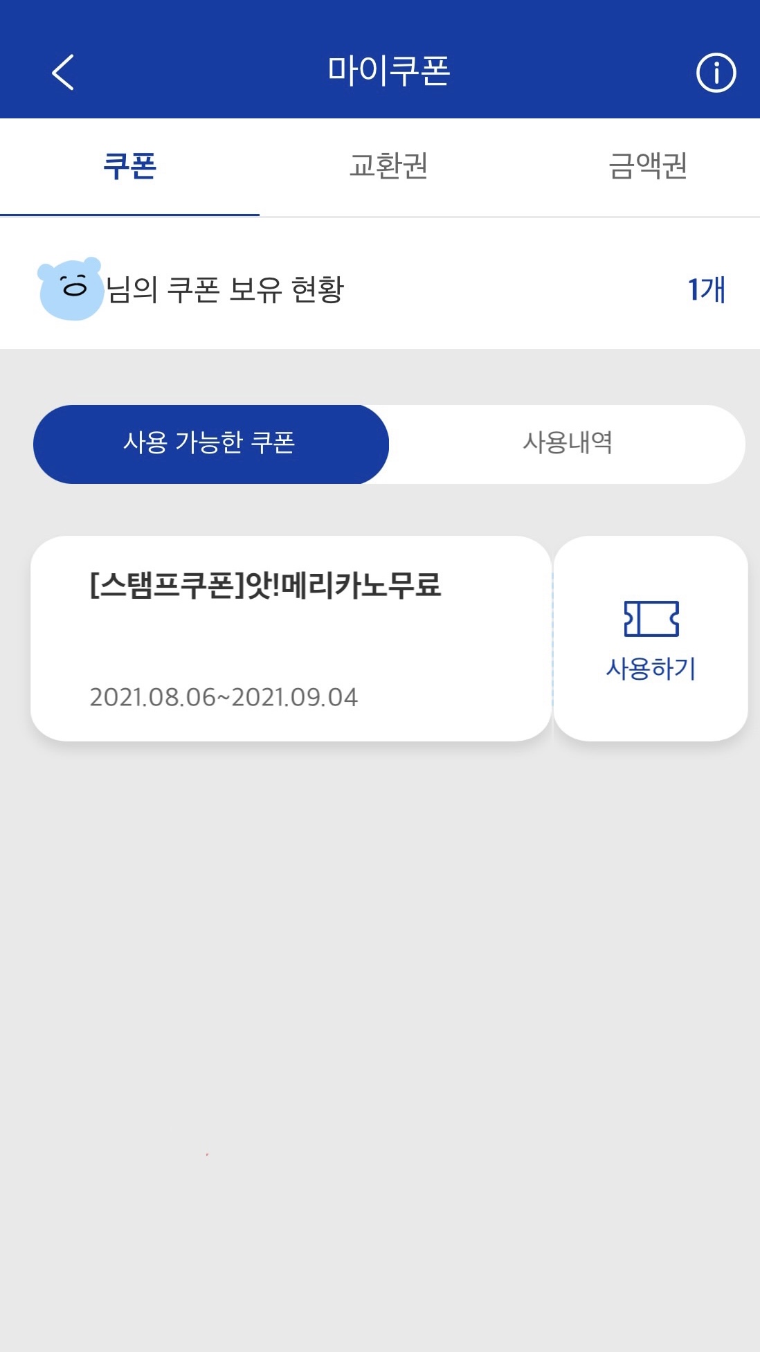 마이쿠폰에 들어가면 발급된 스탬프쿠폰을 확인할 수 있어요. 스탬프쿠폰 기간은 약 1개월정도로 여유있는 편이에요. 메뉴는 앗!메리카노로 한정되어있지만, 추가금액 결제 후 사용가 이상의 타메뉴로 교환도 가능합니다. 단 낮은 가격의 메뉴를 구매하면 차액은 현금으로 지급되지 않아요. 디저트나 아이스크림 메뉴도 불가합니다. 그리고 스탬프쿠폰으로 교환하는 아메리카노는 핫, 아이스 선택 가능해요!